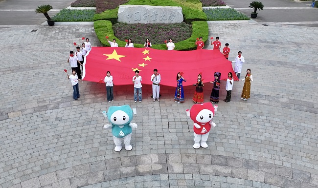 南操场上,12米长的巨幅国旗是最庄重的“青春告白”。数十名学生牵手,小心翼翼地牵引着鲜红的旗帜缓缓展开,阳光洒在国旗上,也映在每个人肃穆的脸庞。“指尖触到国旗的那一刻,突然懂了‘守护’的重量。”参与举旗的同学皮慧方说。不远处,国旗护卫队成员身着军装,迈着铿锵步伐开展升国旗、踢正步训练,挺拔的身姿尽显担当。学生代表身着“青春为中国式现代化挺膺担当”的T恤,字字铿锵喊出报国志,各民族学子穿特色服饰举小国旗齐唱祝福。现场师生纷纷感慨:“不同的模样,同样的爱国心!”