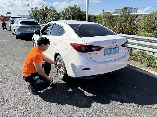 另一边,车主朱先生围着车不停转圈,指着仪表盘向查勘员小詹求助:“刚启动怎么就亮了胎压灯呢?”查勘员小詹立即推来便携式充气泵,蹲下身沿着左后轮仔细检查轮胎表面,确认只是气门芯轻微漏气,便赶忙充气,一并检查了另外三个轮胎的胎压。朱先生的愁云立刻散去。