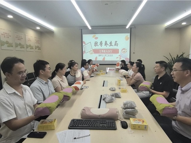 在制作过程中,员工们兴致勃勃地参与其中,有的负责填充艾草,还有的负责整装枕头。大家相互协作、交流经验,活动现场充满了欢声笑语。通过亲手制作艾草枕头,员工们不仅体验了手工制作的乐趣,还感受到传统文化的魅力和深厚底蕴,同时传递了健康养生的理念。不少员工表示,这样的活动既有趣又有意义,希望公司能多组织类似的工会活动。