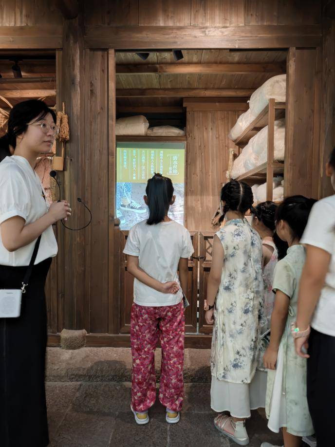 穿过青石板铺就的展区,一幅动态的江南市井图跃然眼前。复原的“鼎昌绸布庄”里,仿制的竹编鱼篓与蓝印花布诉说着手工业的繁荣;“清水丝绵店”旁,孩子们触摸着传统夹花版,听老师解释“如何用草木染出青花瓷般的蓝色”;河岸边,微缩的乌篷船模型与光影投影的摇橹声交织,仿佛让人置身“小桥流水人家”的诗意画卷。有同学模仿起展柜中蜡像的姿势,笑着说:“我现在是古代的小船夫啦!”
