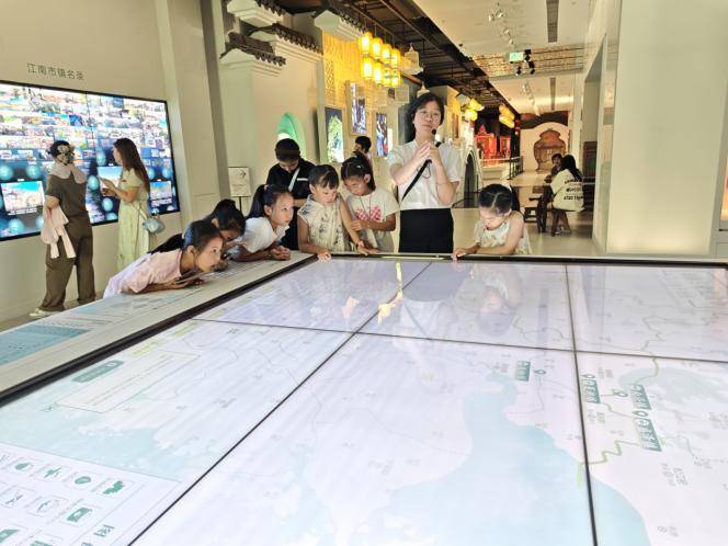 继续走进展厅,仿佛踏入了一幅流动的江南画卷。展厅以“水韵江南”为核心,通过全息投影、场景复原、文物陈列等多元形式,生动再现了江南水乡从古至今的变迁。同学们驻足在“古桥遗韵”展区,触摸着微缩模型中拱宸桥的砖石纹理,听讲解员讲述“一桥跨两岸,舟楫连四方”的繁华往事。
