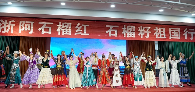 当天,“浙阿石榴红?石榴籽祖国行”交流活动在中国计量大学举行,两地青年以特色互动促进文化交流,让民族团结之花绽满校园。活动伊始,青春分享会成为浙阿青年学子深度交流的重要平台,现场播放的阿克苏地域文化宣传片,让量大学子直观领略了当地的风土人情;两地青年代表则围绕精神传承、青春奋斗等主题,分享成长故事、传递理想信念。从阿克苏的发展变迁到校园里的奋斗点滴,真挚的讲述引发强烈情感共鸣,不仅实现了语言的交流,更搭建起跨越地域的心灵纽带,让交往交流交融的种子在青春对话中悄然发芽。