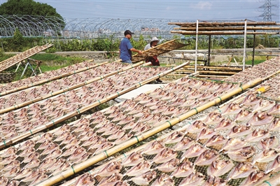 近年来,乐清市沿海各地采取“专业合作社+基地+农户”的模式,将收购来的各种海产品加工、晾晒,制作成传统特色鱼干供应市场,抱团发展促进多渠道就业增收。蔡宽元