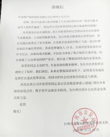 近日,平安产险台州中心支公司与台州市公安局经侦支队通过一年多的能力合作,成功侦破“临海市陈子成等人保险诈骗案”。该案涉案金额超1000万元,一举抓获涉案团伙成员18人,实现全链条打击。平安产险台州中心支公司凭借在案件中的突出贡献,荣获台州市公安局经侦支队致信感谢,警保联动再结实战硕果。