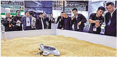 在粮机装备展区,来自深圳的芯禾机器人公司展台前围满了好奇的观众。一台个头不大的机器人,正在玉米粒堆中灵活行走,执行自动化平粮任务。这款机器人机身两侧装有螺旋轮,行走时将高处的玉米粒推至低处,同时还能让机身不陷进玉米堆里。