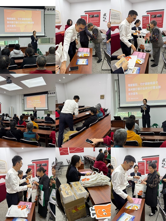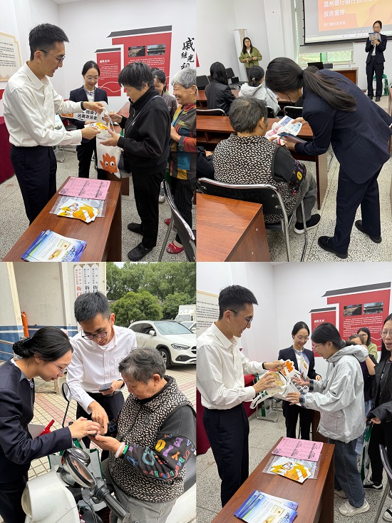 “奶奶,您看这个短信,说您中了大奖要先交手续费,这肯定是诈骗!”“大伯,您在我们银行存的钱,只要是50万以内,都受存款保险保障,特别安全!”近日,椒江衙门巷老年活动中心内热闹非凡,温州银行台州分行营业部的金融宣传小分队带着精心准备的资料和礼品,在这里开展了一场以“情暖重阳,守护银龄钱袋子”为主题的宣传活动,将反诈、存款保险、人民币知识、反洗钱等实用金融知识送到老年人身边。