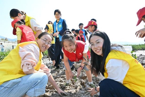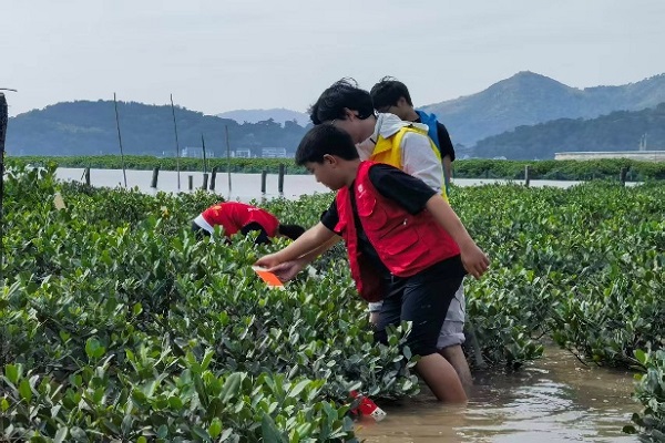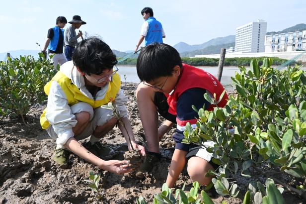 “红树苗什么时候会长高呀?”“它会喜欢这里吗?”滩涂上,小学生们化身为“滩涂园丁”,撸起袖子和裤腿,与本硕博党员志愿者们一道,深一脚浅一脚地踩进柔软的滩涂里,种下一株株红树苗。