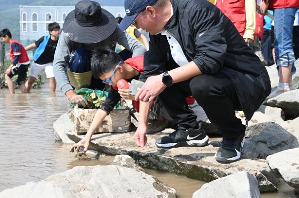 随后,小学生们领取“青蟹习性卡片”及蟹苗,通过任务卡了解青蟹的生活习性后,有序地将它们放归滩涂,并用手机记录下这美好瞬间。