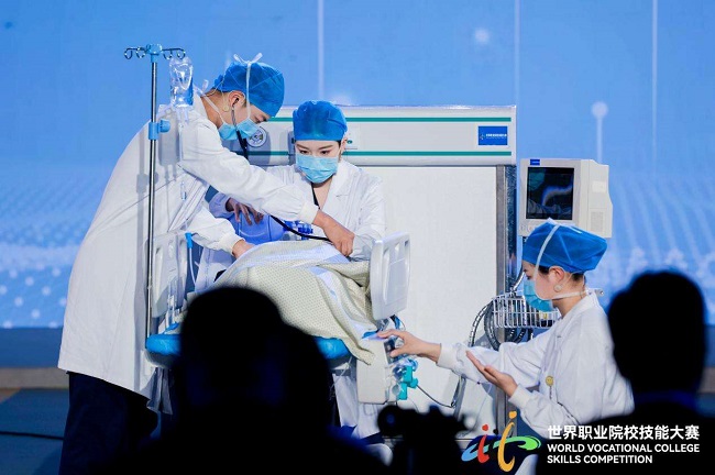 “2025年世界职业院校技能大赛启动后,团队开启了‘白加黑’的攻坚模式。真实的诊疗场景,就是最好的实训课堂。”团队指导教师孔慧梅说。带着这样的理念,团队打破临床医学与医学检验技术的专业壁垒,组建跨学科团队实现优势互补,让技术更贴合临床实际;依托学校附属医院(海棠医院)的真实诊疗环境,开展全真模拟训练,让每一次操作都对接基层诊室的真实场景,比如心电图仪操作、经口气管插管、体外心脏电复律等。同时,团队研发创新融合智慧医疗系统与智能设备,为破解“老年糖尿病酮症酸中毒”的救治难题提供了全新方案。这些创新成果,既瞄准了基层诊疗的“痛点”,更打通了“竞赛技能—临床实践—健康服务”的转化通道。