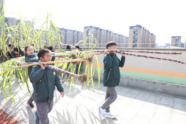 “本草园”是笕弘实验学校依托楼顶空间打造的特色劳动教育基地,自学校成立以来,便成为师生共同耕耘的“空中田园”。从翻土、播种到浇水、施肥,五年级的同学们以班级为单位,定期轮值照料这片“责任田”。此次丰收的甘蔗,正是同学们亲手栽种的成果——当时他们小心翼翼地将蔗苗埋进土里,如今看着一人多高、叶片翠绿的甘蔗林,眼中满是期待与自豪。