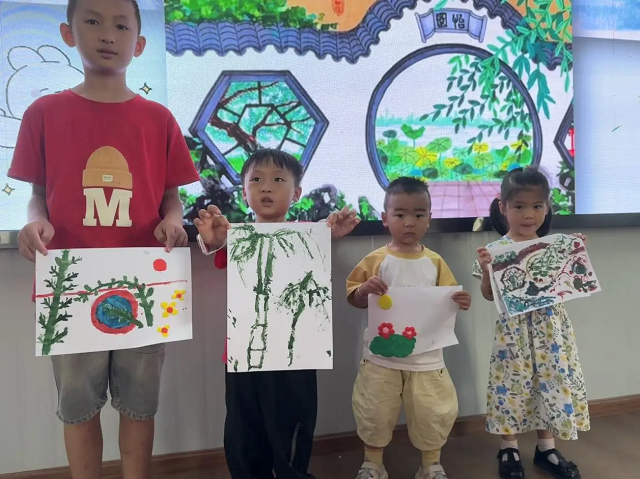 每到周末亲子游玩高峰时段,牧场就会变身“移动美术馆”:高清古画复制品展现在大屏,志愿者们手持画笔示范勾、皴、点、染的技法,孩子们在家长陪伴下,或用黏土捏出水墨山水的轮廓,或在风铃上绘制牡丹、祥云等传统吉祥图案,还有的跟着老师观察牧场里的草木山石,将自然形态转化为绘画语言。