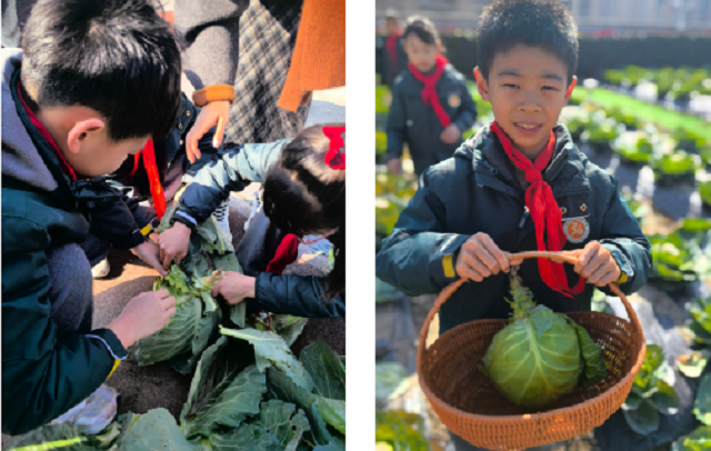 随着“可以采摘啦”的欢呼,孩子们轻手轻脚地走进菜畦,弯腰、观察、紧握、旋转。农场里不时传来惊喜的发现,“我的包菜好像一朵紫绿相间的花!”“原来它穿着这么多层衣服!”每一颗被小心捧起的包菜,都承载着孩子们真实的触感、温度与成就感。这一刻,劳动的“财”富不仅是眼前的收获,更是与土地建立的深厚情感联结。