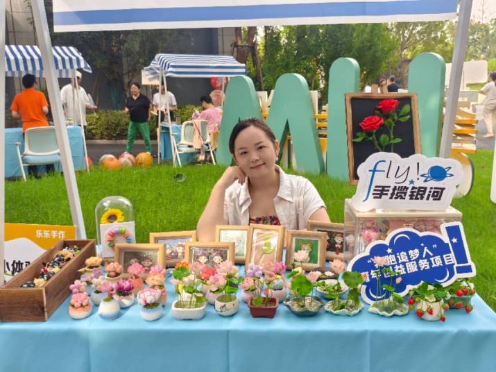来到塑粘土摊位前,青年手艺人乐乐指尖翻飞,寻常的粘土在掌心变成憨态可掬的小植物、精致小巧的摆件。“小时候就喜欢做手工制作,没想到长大后还能把爱好变成事业,还能做公益!”乐乐一边教着孩子们,一边笑着说。因为一些事情,她开始接触了超轻黏土,在学习黏土的制作过程中,她反复琢磨,为了能让制作的植物更加逼真,她不断尝试各种不同的黏土以及收集各种植物图鉴,原创自己的植物石塑黏土作品。并创办自己的工作室,不仅线上线下教授石塑黏土技艺,也通过我们的华睦社区平台开始走进社区开展公益教学。在此次市集中,不仅为孩子们开展教学,还将自己的作品进行展示售出,得到收益将全部用于公益帮扶,让“小粘土”传递“大温暖”。