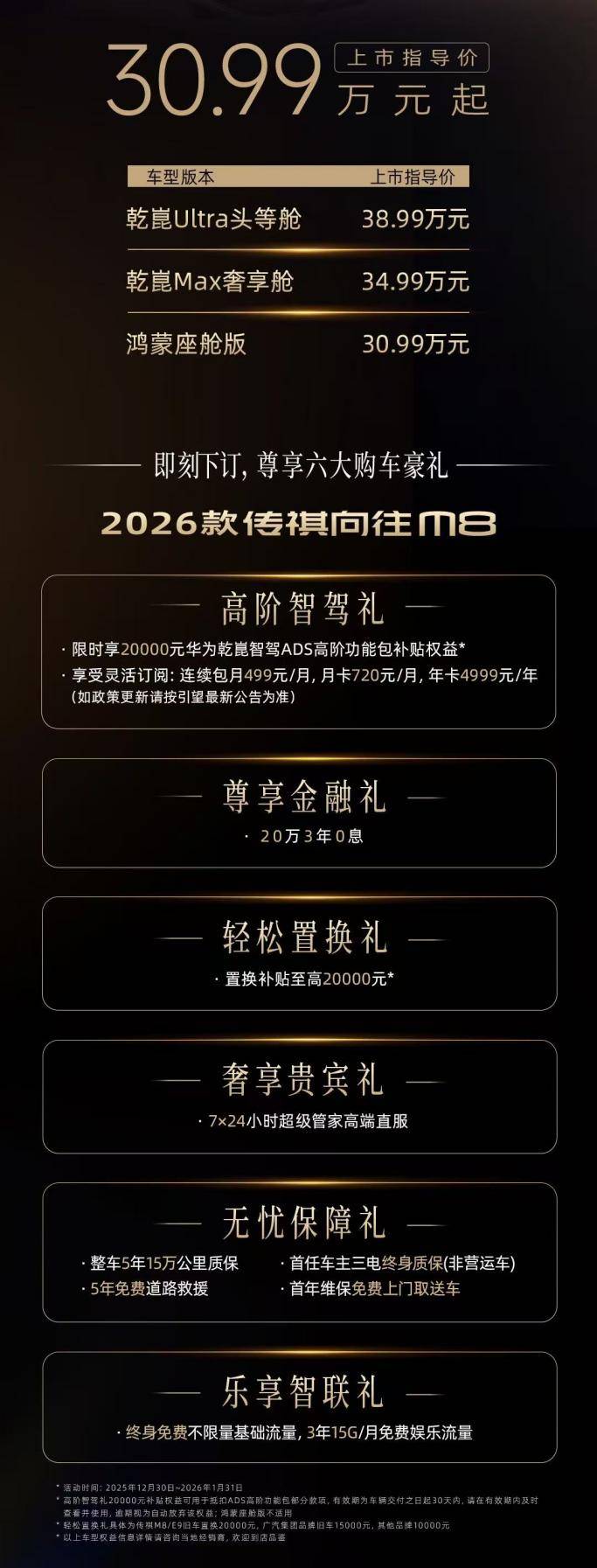 2025年12月30日,正值传祺M8上市八周年之际,2026款传祺向往M8感恩上市,新车上市指导价30.99万元起,限时补贴价仅28.99万元起。为回馈广大用户的长期信赖与支持,即日起下订即可尊享六大专属礼包:置换补贴至高20000元、限时享20000元华为乾崑智驾ADS高阶功能包补贴权益,以及20万3年0息金融礼等丰厚权益。