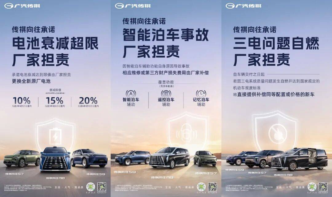 也正是基于庞大的用户数据,让传祺对MPV产品的理解不断深化,除了为用户提供过硬的产品外,在产品保障上也是为用户全生命周期用车安全兜底。针新能源时代用户对电池衰减速度、智能驾驶辅助可靠性、三电系统安全性三大核心焦虑,广汽传祺推出敢为行业先的“三担责”服务政策,承诺电池衰减超限、智能泊车事故、三电问题自燃均由厂家担责,为消费者带来真正无焦虑的移动出行体验。