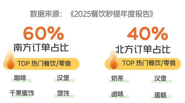 地域上,餐饮秒提呈现出“北方抗饿解馋、南方提神休闲”的消费特性:奶茶、汉堡、卤味、蛋糕成为京津冀等北方城市快速饱腹回血的首选,咖啡、汉堡、干果蜜饯、馄饨则是珠三角以及长三角地区的消费热门。