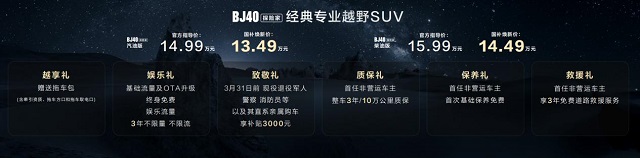 北京越野准备了六重尊享礼遇,价值12000元,现在下订立即享受:越享礼:赠送拖车包(含牵引资质、拖车方口和拖车取电口);娱乐礼:基础流量及OTA升级终身免费;娱乐流量3年不限量、不限流;致敬礼:3月31日前,现役退役军人、警察、消防员等,以及其直系亲属购车享补贴3000元;质保礼:首任非营运车主,整车3年/10万公里质保;保养礼:首任非营运车主,首次基础保养免费;救援礼:首任非营运车主,享3年免费道路救援服务。
