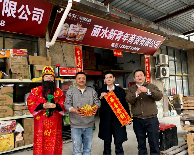 春寒料峭,丽水经济技术开发区内却暖意融融。温州银行丽水分行营业部的金融团队身着喜庆服饰,手捧金灿灿的“元宝”,叩响了一家又一家合作企业的大门。当这份带着吉祥寓意的祝福出现在丽水市某商贸有限公司的仓储中心时,正在理货的员工们惊喜地围拢过来,笑声和祝福声瞬间驱散了早春的寒意。