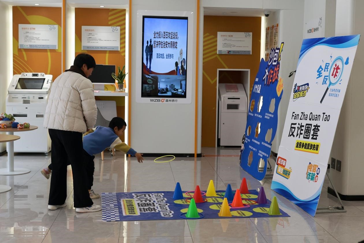 走进温州银行云和支行大厅,映入眼帘的并非传统意义上的业务柜台,而是一个充满欢声笑语的“反诈游乐园”。“中了!这个‘安全账户’打得好!”随着一声喝彩,市民王先生手中的沙包精准击中地面“诈骗陷阱图”上的“凡是叫你汇款到安全账户的”字样。这是该行创新设计的“沙包大作战·八个凡是”游戏区,将电信网络诈骗的典型话术印制在地面展板上,参与者化身“反诈战士”,在投掷中加深对诈骗套路的记忆。每当沙包命中目标,一旁的财富经理便顺势结合近期高发的“AI换脸诈骗”“冒充领导转账”等真实案例,现场拆解骗局逻辑。